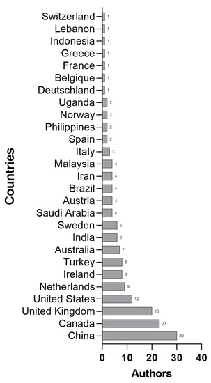 A PHE requires the attention of different areas according to the ambiguities and uncertainties of a context, considering a multidisciplinary approach that includes economic, social, psychological, and health impacts [5], which can be observed in the authors’ areas of knowledge, such as in the Operation Management Area, Indian Institute of Management Ranchi [51], the School of Economics and Finance, Queensland University of Technology [60], and the Centre for Complexity Science, University of Warwick, Coventry, UK [53]. Figure 3 presents a set of characteristics of the studies evaluated in this article, observing the objects and formats of the frameworks studied, grouped according to the components of H-EDRM [1]. In another analysis, the organization of frameworks by authors and countries, as shown in Figure 4, presents a predominance of Chinese, Canadian, British, and American authors.