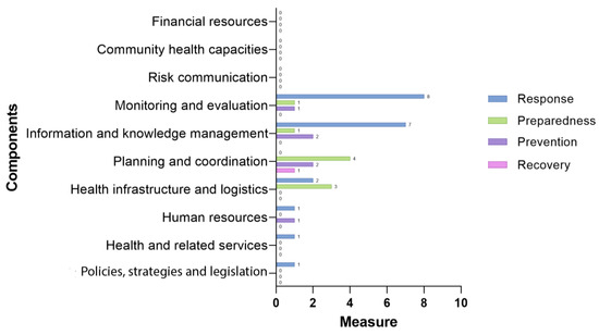 Due to the magnitude that the COVID-19 pandemic has reached since 2020, response efforts predominate, followed by preparedness, prevention, and a recovery measure, suggesting a focus on the system’s reaction; however, the strengthening of preparedness activities affects the evolution of all health systems during a crisis, resulting in a more effective response and capacity for resilience to recovery of the health system.