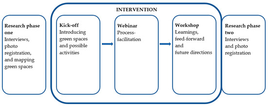 The study included five private small and medium sized companies that were reached through social media or contacted directly. The sample selection criteria for the inclusion of companies were pragmatic and primarily based on the individual organisation’s motivation for participation, a geographical diversification among the participating companies (to strengthen geographical representativeness) and an assessment of the individual company’s scope to include a relevant outdoor environment that both created variety between the participating companies and ensured varied experiences. Employees were invited to attend a process of identifying tasks from their indoor office work and bringing them outdoors. For two months, different types of outdoor activities related to work were facilitated by process consultants with specific knowledge in mental health, organisational change, and outdoor office work. Three 45 min meetings were held: A kick off meeting, a webinar and a workshop at the end of the intervention. Inspiration and learning videos were produced and made accessible to the participants (Figure 1).