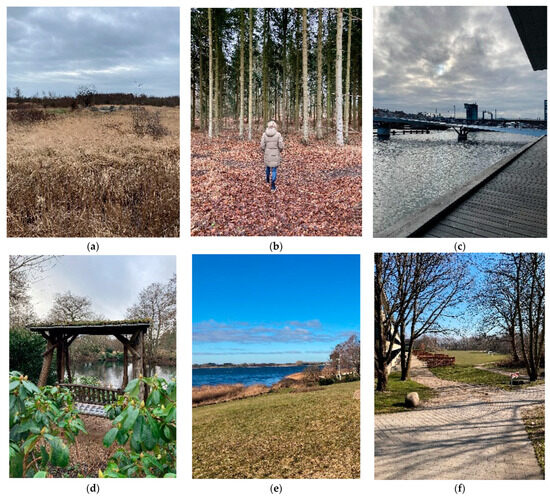 Photo of distinctive greenspace. Note: (a) Nature Park at case 1; (b) Fir forest at case 2; (c) Urban harbor at case 3; (d) Campus at case 4; (e) Park by the sea at case 5; (f) Campus at case 6.