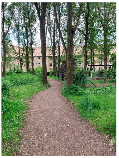 Whole landscapes were also described (2, 3, 4, 6b): “The building is beautiful and there are always flowers. When the trees bloomed and there were chestnuts, it was really beautiful. It’s such a holistic experience to sit here. It’s a really lovely place to sit” (3). “Walk into the woods and find a tree stump or something–there are lots of options. We’re really lucky in that respect–that we don’t just have to go to a park. That it is not set up. It’s nature-nature–not just a lawn” (2).