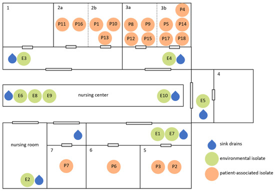 During the observation period, nine cluster events with bacterial pathogens were identified in the NICU. Of these, three were potentially related to sink drains (see also Figure 1).