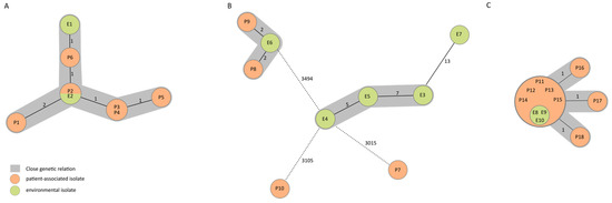 Minimum spanning trees of seven environmental (green) and ten patient-associated (patient and breast milk, orange) isolates display the genotypic relationships based on the 4638 (A) 3867 (B), and 2626 (C) target genes, respectively, and pairwise ignoring missing values. Each circle represents one genotype, and the numbers next to the connecting lines show the number of allelic differences between genotypes. Grey coloring indicates a close genetic relation.