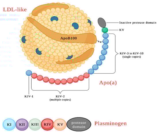 Lp(a) is a low-density lipoprotein (LDL) variant where a large plasminogen-like glycoprotein, i.e., apolipoprotein(a), or Apo(a), is covalently bounded to Apo B100 via one disulfide bridge. Apo(a) contains one plasminogen-like kringle V structure, a variable number of plasminogen-like kringle IV structures (types 1–10), and one inactive protease region [2] (Figure 1). Lipoprotein (a) is synthesized in the liver [3]; its catabolism, however, is not completely understood [4]. Indeed, Lp(a) has a longer plasma half-life than LDL, suggesting a distinct metabolic pathway involved in its degradation. Because of its configuration and composition, Lp(a) is able to interact with different receptors, such as the LDL receptor protein megalin, very-low-density lipoprotein (VLDL) receptor, galactose-specific asialoglycoprotein receptor (ASGPR), plasminogen receptor, and macrophage receptors [5].