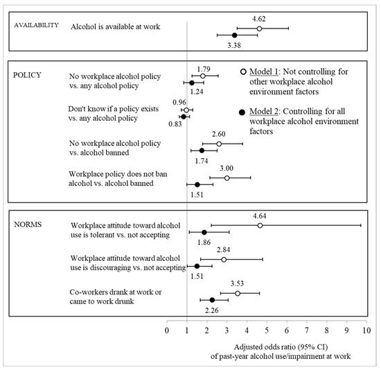 Adjusted odds ratios (with 95% confidence intervals) of alcohol use or impairment at work in the past year given workplace alcohol environment factors. Note: Based on logistic regression estimates adjusted for concurrent general high-risk drinking in the past year, covariates (sex, race, four-year college degree, full-time student, parent, married, current financial problems, months of full-time employment in the past year, high-risk industry, and adolescent alcohol use).