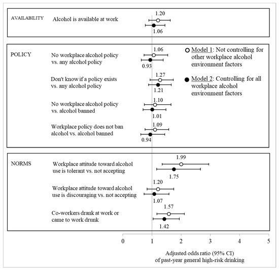 Adjusted odds ratios (with 95% confidence intervals) of general high-risk drinking in the past year given workplace alcohol environment factors. Note: Based on logistic regression estimates adjusted for concurrent alcohol use or impairment at work in the past year, covariates (sex, race, four-year college degree, full-time student, parent, married, current financial problems, months of full-time employment in the past year, high-risk industry, and adolescent alcohol use).