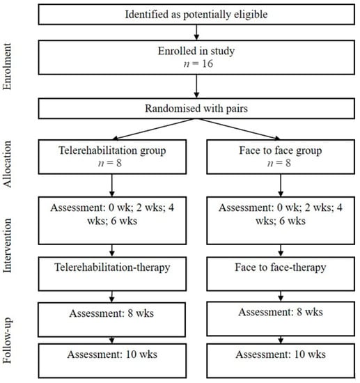 - Muñoz-Tomás, M.T.; Burillo-Lafuente, M.; Vicente-Parra, A.; Sanz-Rubio, M.C.; Suarez-Serrano, C.; Marcén-Román, Y.; Franco-Sierra, M.Á. Telerehabilitation as a Therapeutic Exercise Tool versus Face-to-Face Physiotherapy: A Systematic Review. Int. J. Environ. Res. Public Health 2023, 20, 4358. [Google Scholar] [CrossRef] [PubMed]