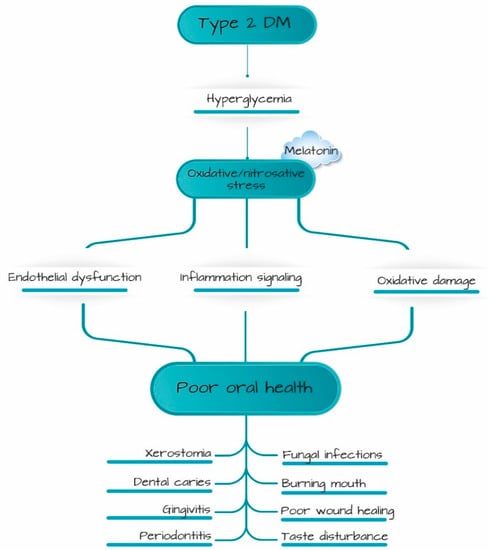 Conditions associated with poor oral health due to type 2 diabetes-induced deterioration of function of salivary gland and dental pulp. Melatonin may be protective in oral tissues in diabetes by targeting oxidative–nitrosative stress.