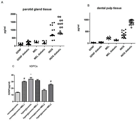 Expression levels of different proteins in human non-diabetic and diabetic parotid gland (A) and dental pulp (B) as well as effects of different concentrations of MEL on GDNF protein expression levels in normoglycemic and hyperglycemic human dental pulp cells (C). The graphs (A,B) represent individual measurements of expression levels of MEL, GDNF and iNOS in parotid gland and dental pulp. Box plots (C) represent mean ± SD. * p < 0.05 normoglycemic compared to hyperglycemic cells, Mann–Whitney test # p < 0.05 cells with compared to without MEL. Mann–Whitney test; MEL1 = 0.1 mM; MEL2 = 1 mM.