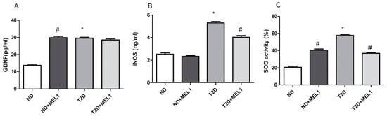 Higher levels of GDNF, iNOS and SOD activity were shown in diabetic compared to non-diabetic hPGCs. Addition of MEL (0.1 mM) increased GDNF and SOD levels in non-diabetic hDPCs and decreased iNOS and SOD levels in diabetic hDPCs (Figure 3)