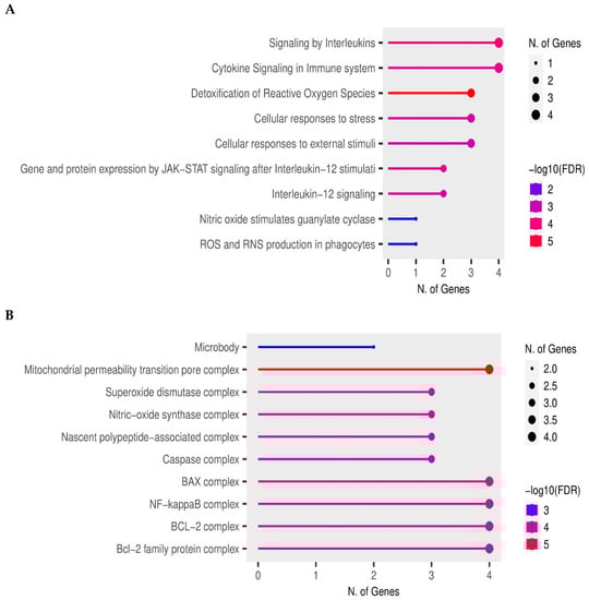 Bioinformatic tools presently engaged contain detailed information on biological pathways and processes in humans from the primary literature, representing peer-reviewed databases of different signaling molecules and their roles and relations, and thus allow for finding functional relationships between different signaling molecules in general. ShinyGO (v.0.75) application was used [] (Available online: http://bioinformatics.sdstate.edu/go/, accessed on 15 April 2023) to perform the Compartments, RegNetwork and Reactome analyses. To investigate which common transcription factors (TF) interact with the investigated genes, we chose the “TF.Target” gene sets from RegNetwork []. The Compartments resource unifies complementary evidence on protein subcellular localization from curated knowledge, high-throughput experiments, text mining and sequence-based prediction methods []. Reactome is a freely available knowledgebase that consists of manually curated molecular events (reactions) organized into cellular pathways (https://reactome.org/, accessed on 15 April 2023) [].