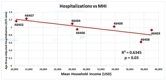 Age-group-adjusted COVID-19 hospitalizations versus median household income of zip codes in Gary, Indiana, are presented in Figure 2. As the median household income of a zip code decreases, the number of hospitalizations increases.