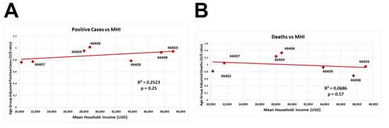 Age-group-adjusted COVID-19 number of positive cases and deaths versus median household income in Gary, Indiana, by zip code. Age-group-adjusted number of positive cases (A) and deaths (B) of seven different zip codes (46402, 46403,46404, 46406, 46407, 46408, and 46409) in the city of Gary were plotted against median household income by the zip code (red square, USD/year). Trendline represents the linear regression (A: R2 = 0.25, p = 0.25; B: R2 = 0.06, p = 0.57). Significance was determined using a linear regression analysis.