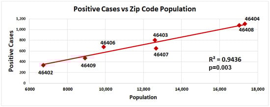 Number of COVID-19-positive cases correlates with the population size in Gary, Indiana, by zip code. Positive cases (number) of seven different zip codes (46402, 46403, 46404, 46406, 46407, 46408, and 46409) in the city of Gary were plotted against population size of the zip code (red circles, number of positive cases). Trendline represents the linear regression (ρ = 0.9436, p = 0.003). Significance was determined using a linear regression analysis.