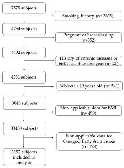 Subjects who had a smoking history (n = 2825), were pregnant or breastfeeding (n = 352), had a history of chronic diseases, or birth within less than one year of this study (n = 21) were excluded from this study. Subjects under 19 years old were not included (n = 541). Those who did not have sufficient or applicable data for BMI (n = 490) and those whose food frequency data for omega-3 fatty acid intake were insufficient or missing (n = 198) were also excluded from this study. Following inclusion and exclusion criteria, 3152 subjects remained suitable for this study (Figure 1).