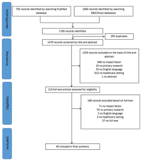 In total, 1765 records were identified, with 295 duplicates. Screening of the 1470 records on relevance resulted in 1256 exclusions. Full texts of the 214 remaining records were reviewed for eligibility, resulting in 46 included articles. The literature research process is summarized in Figure 1.