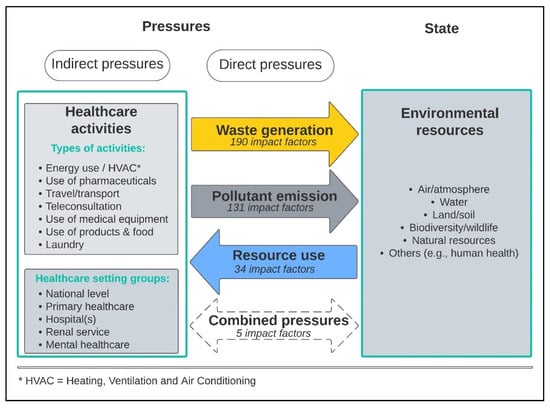 Factors were then mapped to the pressures-state-response framework of the Organisation for Economic Co-operation and Development (OECD) [16] based on their scope and healthcare setting. This OECD framework differentiates between direct and indirect environmental impacts. Indirect impacts are human activities, and direct impacts are the pressures of these activities on the environment. In this study, the human activities are the healthcare activities, and the impact factors describe the direct pressures on the environment resulting from these activities. Incongruencies in data analysis between the two researchers were discussed and resolved as part of the coding process.