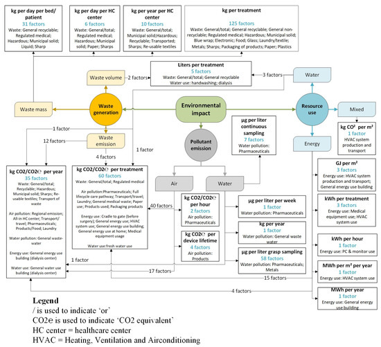 Factors for resource use were divided into groups aimed at measuring the use of water, the use of energy, and factors for mixed resource use. While factors for water use were all reported per treatment, energy use was described by a multitude of units, including the energy use per square meter of a healthcare center. The measurement units “kg CO2/CO2eq per year” and “kg CO2/CO2eq per treatment” were used to describe impact factors in five and four different categories, respectively. Air pollution was in all cases defined in terms of carbon emission measures, while water pollution factors used the weight of substances besides carbon emission equivalents. Factors related to waste generation all used the weight or volume of waste, however, for various units such as per patient, per bed, per day or per year for an entire healthcare center. The measurement unit “Liters per treatment”’ was used to describe factors related to volume of waste as well as volume of water used.