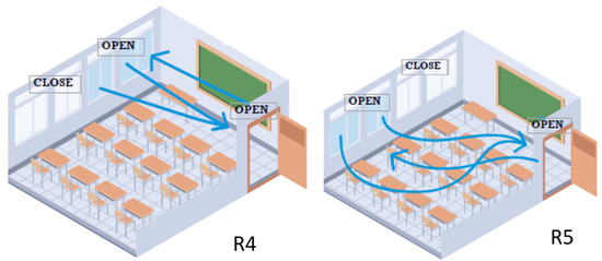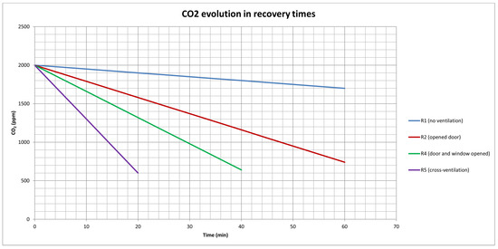 Using an example of a classroom shown in Figure 3 and assuming 2000 ppm of CO2 concentration before starting the recovery time, it would take 200 min with no apparent air ventilation (classroom closed) to achieve 1000 ppm (as maximum recommended value), 47.62 min with only a door open, around 30 min with doors and windows open, and only approximately 14 min with cross ventilation.