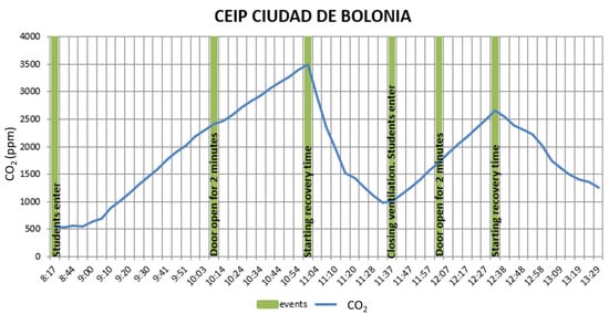 Figure 2 shows the CO2 concentration evolution before starting the lectures, with the different events taking place, and after the lecturing day. These events show a modification in the initial variables (type of ventilation, activity, ratio of students, etc.)