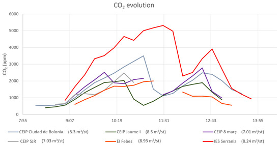 The following supporting information can be downloaded at: https://www.mdpi.com/article/10.3390/ijerph20186757/s1, Table S1: Aditional classrooms info; Figure S1: CO2-events in CEIP Fabian y Fuero 8 years; Figure S2: CO2-events in CEIP Fabian y Fuero 9 years; Figure S3: CO2-events in CEIP Fabian y Fuero English lab; Figure S4: CO2- events in CEIP Fabian y Fuero English lab; Figure S5: CO2-events in CEIP Humanista Mariner 5 years; Figure S6: CO2-events in CEIP Humanista Mariner 11 years; Figure S7: CO2-events in CEIP Jaume I; Figure S8: CO2-events in CEIP López Rosat Music classroom; Figure S9: CO2-events in CEIP 8 de Març; Figure S10: CO2-events in CEIP SJR 8 years; Figure S11: CO2-events in CEIP SJR 9 years; Figure S12: Correlation between CO2 evolution and volume ratio.
