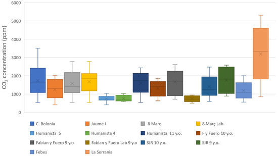 Figure 5 shows that IES Serranía has the highest CO2 (ppm) registered values; it also shows a wide range of values. The frequent low ventilation and the good insolation of the building can be the cause of this dispersion.