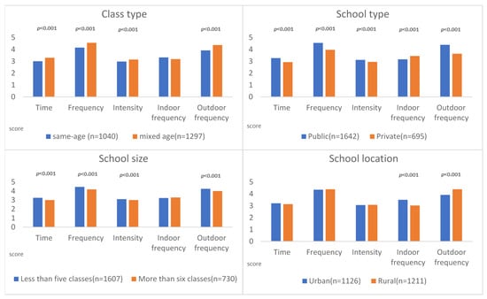 We carried out a comparison of differences in the implementation of physical movement courses during the COVID-19 pandemic considering different background variables. The independent sample t-test was used to find out the difference in implementation of physical movement courses. The results were as follows. In addition to the frequency of implementing physical movement courses indoors every week, mixed-age classes performed better than same-age classes. Regardless of the frequency, time, intensity, or outdoor course implementation, public schools performed better than private schools. Private schools implemented physical movement courses indoors every week, more frequently than public schools. Excepting the frequency of implementing physical movement courses indoors, fewer than schools with five classes performed better than those with more than schools with six classes. Finally, concerning the frequency of implementing physical movement courses indoors every week, urban schools were better than rural schools. Rural schools were better than urban schools in frequency of implementing physical movement courses outdoors every week. All information is presented in Table 3 and Figure 2.