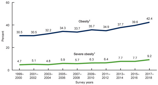 The fact that over 71% of U.S. adults are overweight or obese highlights the importance of this topic [2,3], and this trend has been increasing in recent years (see Figure 1).