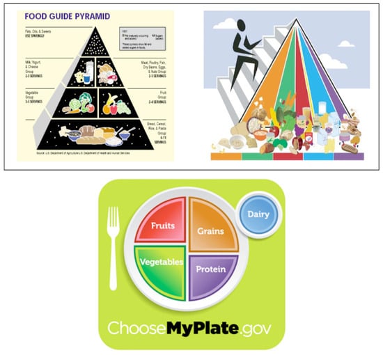 Another aspect of the DGA further complicates how successful the USDA and HHS have been at disseminating dietary education to Americans. The contemporary history of the DGA over the past 15 years reveals several significant changes related to increasing physical activity, the consumption of healthier fats rather than less healthy alternatives, the importance of whole grains, increasing dairy consumption, and reducing sugar intake. To communicate these substantive changes to consumers, the graphic representation of the traditional Food Pyramid was modified and replaced with a new MyPyramid graphic that organized the food groups in vertical categories instead of horizontally. The different colors represent the food groups, and the person running beside the graph symbolizes the need to exercise. Figure 2 presents these three images and will serve as an organizer in the discussion of portions and the emphasized changes over the years (brief history available at https://www.choosemyplate.gov/brief-history-usda-food-guides) (accessed on 12 March 2023).