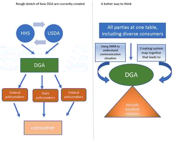 Communication regarding healthy eating in the U.S. quickly becomes a labyrinth for the consumer. Brands are trying to persuade consumers to buy their products. Various federal (FDA, USDA, HHS, etc.), local, and regional government groups are communicating their dietary missions. A myriad of family, friends and health providers are mining available information and passing it along to their personal and professional networks as necessary. As is common in our society, this creates a lot of information, and sometimes misinformation, that most often lacks coordination and is difficult for busy consumers to filter through and decide what to act on. The DGA, and nutrition communication in general, would benefit from the systems approach that has been successfully used to tackle other complex social issues like homelessness and education inequality [1].