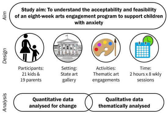 In this study, we sought to understand the parental perspectives (acceptability), feasibility (viability and practicality), and effectiveness of an eight-week AEP pilot at a state gallery for children with anxiety. The goal was addressed through qualitative (interviews, observations, and evaluations) and quantitative (anxiety scale and evaluative) measures. This program considered a people (parents and children)–place (gallery setting)–activity (the arts)–time (eight weeks) approach, as shown in Figure 1.