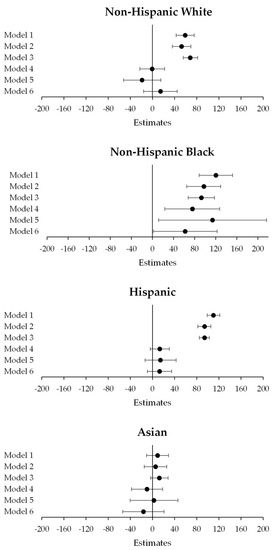 Forest plot summarizing results of linear regression analyses (Models 1–6) by race/ethnicity.