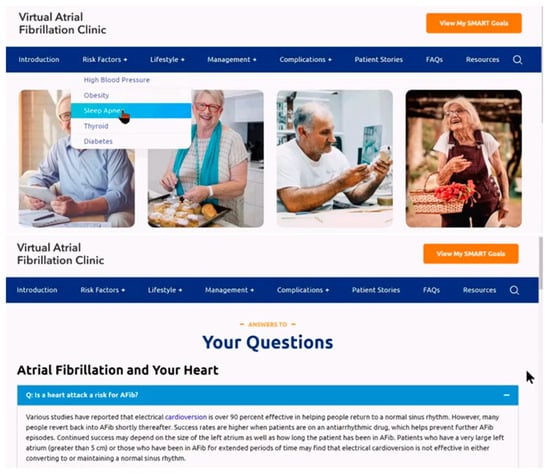 - Desteghe, L.; Germeys, J.; Vijgen, J.; Koopman, P.; Dilling-Boer, D.; Schurmans, J.; Delesie, M.; Dendale, P.; Heidbuchel, H. Effectiveness and usability of an online tailored education platform for atrial fibrillation patients undergoing a direct current cardioversion or pulmonary vein isolation. Int. J. Cardiol. 2018, 272, 123–129. [Google Scholar] [CrossRef]
