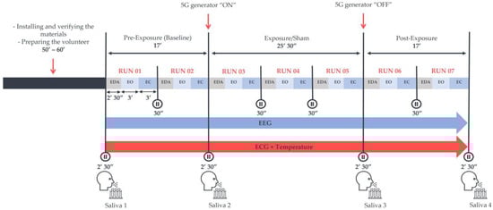 The experimental protocol was preceded by a volunteer preparation phase of approximately 60 min. The protocol included three exposure conditions: the pre-exposure (Baseline), “real” or “sham” exposure, and post-exposure periods. Each exposure and post-exposure period contained 2–3 runs of recording phases that started with the acquisition of electrodermal activity (EDA). Subsequently, 3 min of the eyes-open (EO) condition followed by 3 min of the eyes-closed (EC) condition were recorded in a wakeful resting environment, where an electroencephalogram (EEG) and an electrocardiogram (ECG) were continuously acquired in an electrically shielded room. Four saliva samples were also collected in both sessions to assess some salivary biomarkers of stress.