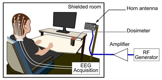 The exposure system setup comprised a horn antenna, a dosimeter to control the exposure parameters, and a 3.5 GHz generator connected to a signal amplifier. The experimental protocol was performed in an electrically shielded room. Abbreviations: EEG, electroencephalography; RF, radiofrequency.