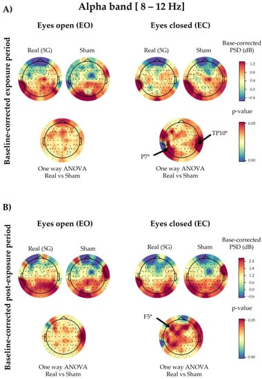 Topographical maps of the alpha electroencephalographic (EEG) band of the baseline-corrected exposure (A) and post-exposure (B) periods. The outcomes are shown separately for the eyes-open (EO) (left) and eyes-closed (EC) (right) conditions of the “real” and “sham” sessions (upper lines). The upper colour bars on the right indicate the differences in power spectral densities (PSDs) in decibels between the baseline and exposure or post-exposure periods, respectively. The results of one-way analysis of variance (ANOVA) are shown in the lower lines of each corresponding topographical map. Significant electrodes (p < 0.05) are noted with an asterisk (*).