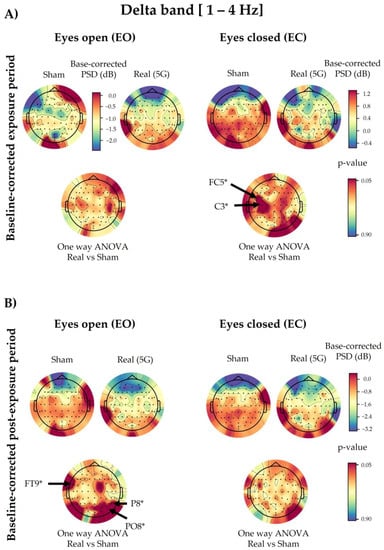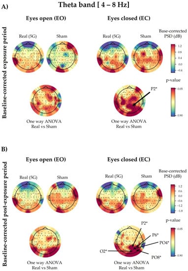 Topographical maps of the theta electroencephalographic (EEG) band of the baseline-corrected exposure (A) and post-exposure (B) periods. The outcomes are shown separately for the eyes-open (EO) (left) and eyes-closed (EC) (right) conditions of the “real” and “sham” sessions (upper lines). The upper colour bars on the right indicate the differences in power spectral densities (PSDs) in decibels between the baseline and exposure or post-exposure periods, respectively. The results of one-way analysis of variance (ANOVA) are shown in the lower lines of each corresponding topographical map. Significant electrodes (p < 0.05) are noted with an asterisk (*).