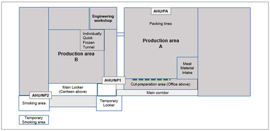 - Walshe, N.; Fennelly, M.; Hellebust, S.; Wenger, J.; Sodeau, J.; Prentice, M.; Grice, C.; Jordan, V.; Comerford, J.; Downey, V.; et al. Assessment of Environmental and Occupational Risk Factors for the Mitigation and Containment of a COVID-19 Outbreak in a Meat Processing Plant. Front. Public Health 2021, 9, 769238. [Google Scholar] [CrossRef]