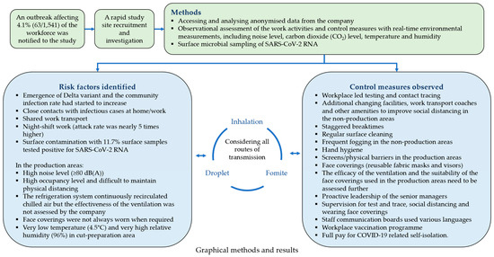 - Raja, A.I.; van Veldhoven, K.; Ewuzie, A.; Frost, G.; Sandys, V.; Atkinson, B.; Nicholls, I.; Graham, A.; Higgins, H.; Coldwell, M.; et al. Investigation of a SARS-CoV-2 Outbreak at an Automotive Manufacturing Site in England. Int. J. Environ. Res. Public Health 2022, 19, 6400. [Google Scholar] [CrossRef]
