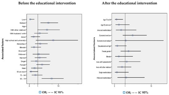 Figure 2 presents the bivariate analysis of the differences in the means of the composite indicator between the CG and the IG, before and 6 months after the educational intervention, as well as the possible association between said differences and the demographic variables. Before the educational intervention, no statistically significant differences were observed in the mean score of the composite indicator of knowledge between the groups (OR 1.35; 95% CI 0.63–2.90; p > 0.05), while after the educational intervention, statistically significant differences were found (OR 3.74; 95% CI 1.43–9.79; p < 0.05). Prior to the educational intervention, none of the demographic variables were associated in a statistically significant way, except for the age group of 65 to 74 years (OR 5.30; 95% CI 1.76–15.95; p < 0.05). In the post-intervention phase, three variables associated in a statistically significant way with the difference in the mean score of the composite indicator of knowledge between the groups were identified; namely, the female gender (OR 5.66; 95% CI 2.2–14.59; p < 0.001), living with other relatives (OR 4.01; 95% CI 1.31–12.24; p < 0.05) and the middle economic stratum (OR 6.13; 95% CI 2.37–15.85; p < 0.001) (Supplementary Table S2).