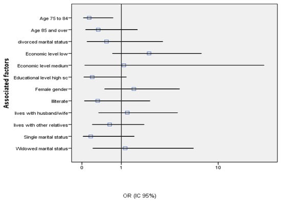 Figure 3 illustrates that none of the demographic characteristics were associated with the differences in the averages of the composite indicator related to knowledge about healthy eating between the CG and the IG after the educational intervention, except the age group from 75 to 84 years, taking as reference the group of 65 to 74 years. For each of the demographic characteristics, a reference group was also considered, namely, for the gender variable, male; for the marital status, married; for educational level, primary; for who do you live with, alone; for economic level, high. Although the age group of 75 to 84 years influenced the knowledge differences between the groups after the educational intervention, it is necessary to consider that this difference depends on the other demographic variables that do not affect the results of the educational intervention (Supplementary Table S3).