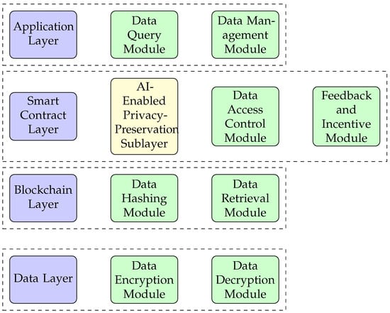 Depending on the nature and purpose of the data request, the AI system within the privacy-preservation sublayer selects the most suitable method. The AI techniques employed within the privacy-preservation sublayer are based on machine learning algorithms; more specifically, decision trees. The AI system employs a decision-making process to determine the most appropriate privacy-preserving technique based on the purpose of the data request, the sensitivity level of the data, and the data owner’s privacy preferences. The AI system continually learns from the feedback received from data owners and requesters, which enhances its decision-making accuracy over time. Furthermore, robust measures, such as cross-validation techniques, are incorporated to improve the AI’s performance, ensuring a reliable privacy-preserving mechanism. It reviews the data owner’s privacy policies and preferences, applies the chosen technique to the data, and then ensures the data are encrypted and stored in the blockchain layer.