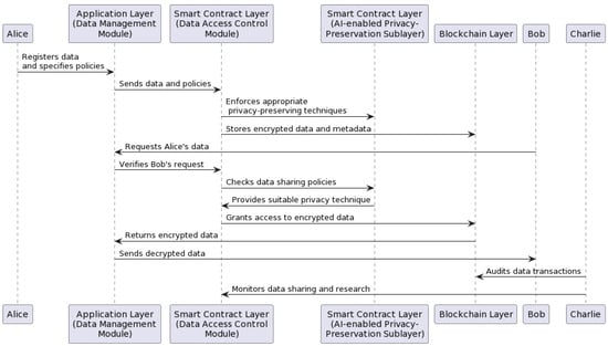 Bob uses a Web portal application to access the biomedical data of the patients participating in the research. Upon logging into the Web portal, Bob provides his authorisation credentials and details of his research project and specifies the data request; i.e., requesting Alice’s data. The framework queries Alice’s data using the data query module. The data query module sends Bob’s request to the smart contract layer where the data access control module and the AI-enabled privacy-preservation sublayer are triggered. The data access control module verifies Bob’s credentials and checks Alice’s policies and preferences for data sharing, and if access is granted, the privacy-preservation sublayer selects the appropriate privacy technique (anonymisation, obfuscation, or differential privacy).
