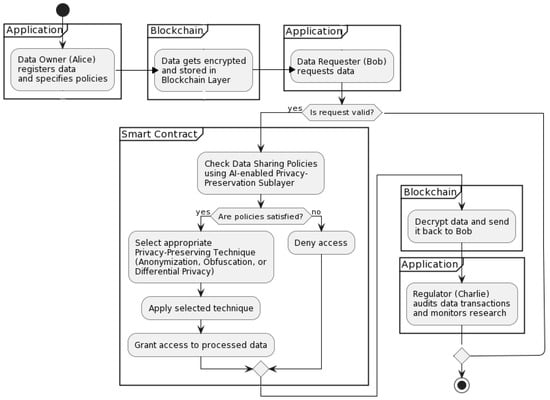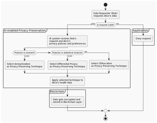 Figure 6 illustrates the sequence of operations in the privacy-preservation sublayer. It starts with Bob’s data request. Based on the purpose of his request (research, statistical analysis, or other), the AI-enabled privacy-preservation sublayer selects and applies the most appropriate privacy-preserving technique (anonymisation, differential privacy, or obfuscation) to Alice’s health data. These processed data are then encrypted and stored in the blockchain layer. Meanwhile, the regulator (Charlie) monitors and audits these privacy-preserving operations. If Bob’s request is deemed invalid, then the request is denied.