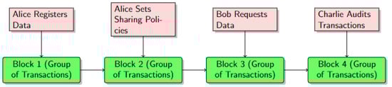 A blockchain interaction diagram is also provided in Figure 4. It provides a detailed overview of the flow of users’ triggered events within the blockchain network. These are the transactions initiated by the users of BCR. The sequence of blocks (i.e., block one, block two, block three, and block four) is depicted in Figure 4. Each of these blocks encapsulates a group of transactions. For instance, block one represents the group of transactions in which Alice registers her data using the data module of her mobile application. For this transaction to be executed on the blockchain network, block one is created. Block two represents the group of transactions in which Alice sets her data-sharing policies and preferences using the smart contract layer. This transaction, like the first one, is added to the blockchain network, and block two is linked to block one, maintaining the chain’s integrity. Block three represents the transactions in which Bob requests access to Alice’s data using the data query module. Once Bob’s request is approved, this transaction is also added to the blockchain, creating block three, which is linked to block two. Lastly, block four contains the transactions relevant to Charlie, such as auditing the data, which are also recorded on the blockchain as block four. A link to block three is then established.