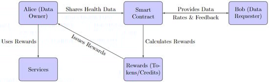 The feedback and incentive mechanism diagram depicted in Figure 5 represents the interactive process that drives data sharing and quality in the blockchain-based framework. Alice, the data owner (in this case, a patient), shares her health data, which include her monitored blood glucose and blood pressure levels. This data are sent to the smart contract module within the blockchain layer of BCR. Alice’s health data are shared with Bob, the data requester in this scenario. As part of this interactive process, Bob provides feedback and ratings for the quality and accuracy of Alice’s data. This feedback is communicated back to the smart contract module, which is responsible for maintaining a fair and transparent data-sharing environment. The smart contract then calculates the rewards for Alice based on the quality and quantity of her shared data and the satisfaction level derived from Bob’s feedback. These rewards are issued in the form of tokens or credits. Alice can then use these tokens or credits to access various services. These services could be within the blockchain platform, such as premium healthcare features, or potentially external benefits. This incentive mechanism rewards Alice for her data contribution and encourages her to continue providing high-quality and accurate data. In this scenario, Charlie can oversee the whole process to ensure all parties are following ethical practices.