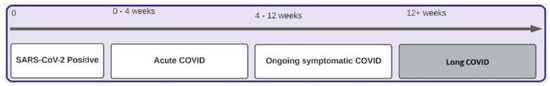 On 30 October 2020, the National Institute for Health and Care Excellence (NICE), the Scottish Intercollegiate Guidelines Network (SIGN), and the Royal College of General Practitioners (RCGP) jointly proposed an integrative definition of long COVID as symptoms that persist or develop after acute COVID-19. The following long COVID classification has been defined as (i) acute COVID-19 (symptoms for up to 4 weeks), (ii) ongoing symptomatic COVID-19 (symptoms for 4–12 weeks), and (iii) post-COVID-19 syndrome (symptoms formed during or after infection and continuing for more than 12 weeks) (Figure 1). The term “long COVID” in this guideline refers to both subgroups, ongoing symptomatic COVID and post-COVID syndrome [23,24]. In October 2021, the World Health Organization applied the Delphi consensus technique to establish a unified clinical case definition, using the phrase “post-COVID-19 condition” [22].
