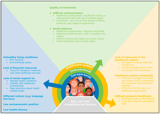 At the intrapersonal level, barriers to healthcare include unhealthy living conditions such as poor housing and environmental stress [16], low health literacy [30,31,32], limited economic resources such as lack of funds for transportation, medication, and user-paid healthcare services like physiotherapy or dental care [30,32,33,34], insufficient social support [16,33,34], and cultural differences such as language barriers. At the interpersonal level, barriers include communication difficulties stemming from healthcare professionals’ inadequate interpersonal skills and use of medical jargon, as well as individuals’ lack of trust due to previous negative experiences and feelings of embarrassment, and social distance resulting from healthcare professionals’ prejudices, labelling, lack of empathy, and disrespect, as well as differing choices and perspectives [16,34,35,36,37,38,39]. At the system level, barriers include (1) lack of resources in the healthcare system and the hereof shortage of healthcare professionals resulting in limited time to address the complex needs of individuals in vulnerable situations [16,33,39,40]; (2) healthcare system complexity, making it challenging for people in vulnerable situations to navigate and comprehend the necessary processes and procedures [16,25,30,33,41]; and (3) difficult access to primary care physician and specialised treatment [25,30,31,41,42,43,44].