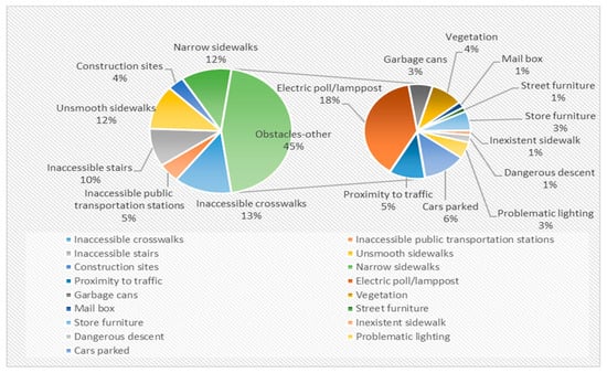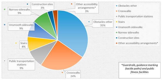 Among the 426 entities (77% of all documented entities) categorized as “accessibility barriers”, 45% were “obstacles-other”, (Figure 2).