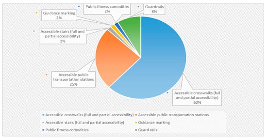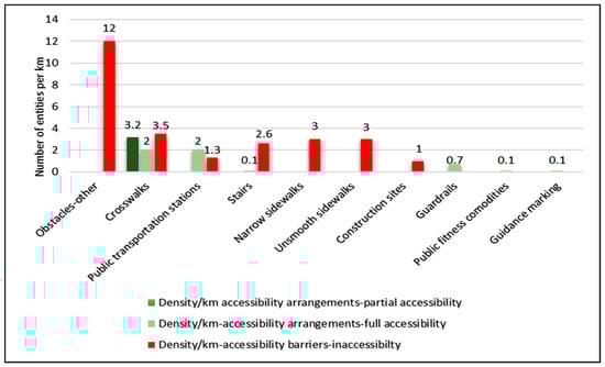 The density of accessibility barriers was 26.5/km, compared with only 8/km accessibility arrangements and with a 12/km density for obstacles. We found a low density of guidance marking intended for individuals with VI (0.1/km) (Figure 4).